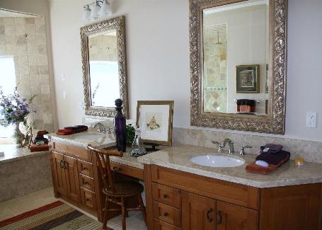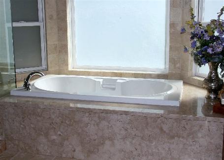 The master bedroom is located on the main level of the house. It features a built-in gas burning fireplace, decorated ceiliing, french door walk-out to backyard and patio, spacious walk-in closet with skylights, state-of-art master bathroom with jacuzzi tub, shower closet and marble-topped double-sink vanity.
